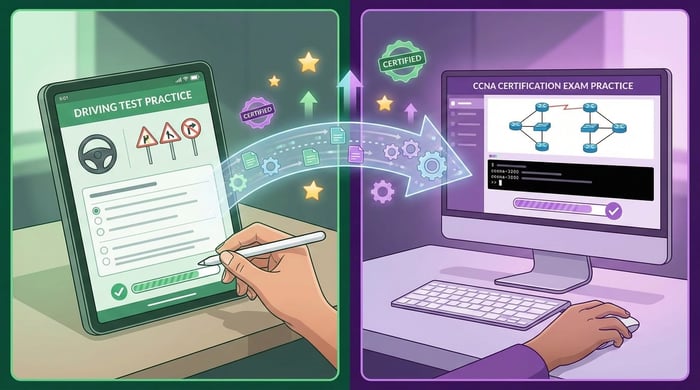 Vous n'iriez pas passer votre permis sans avoir fait des dizaines de tests. Pour le CCNA, c'est pareil ! Un administrateur réseau expérimenté avec des années de terrain a de fortes chances de louper le CCNA s'il n'a pas préparé spécifiquement l'examen.