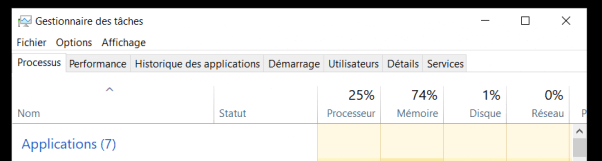 Astuce : Vérifiez les ressources disponibles via le gestionnaire des tâches. Par exemple :
