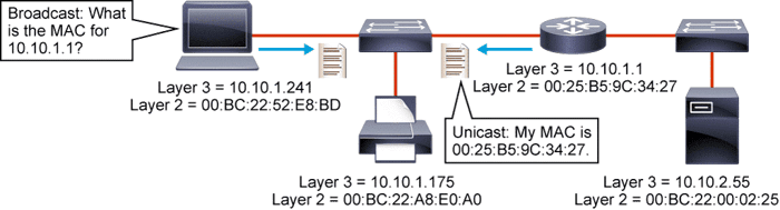 Étant donné qu'ARP est un protocole de couche 2 avec une portée limitée au LAN local, un hôte IP peut indiquer si l'hôte IP avec lequel il souhaite communiquer est sur le même réseau en comparant l'adresse IP de destination avec son masque de sous-réseau configuré. Par exemple, l'hôte 10.10.1.241/24 est sur le réseau 10.10.1.0. Si l'hôte IP avec lequel il veut communiquer est 10.10.1.175, il sait qu'il est également sur le réseau local 10.10.1.0 et peut lui demander directement son adresse MAC.