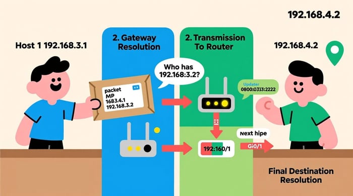 La transmission de paquets d'un hôte à un autre implique une séquence complexe d'opérations. Analysons en détail le processus complet lorsque l'hôte 192.168.3.1 envoie des données vers l'hôte 192.168.4.2, situé sur un sous-réseau différent.