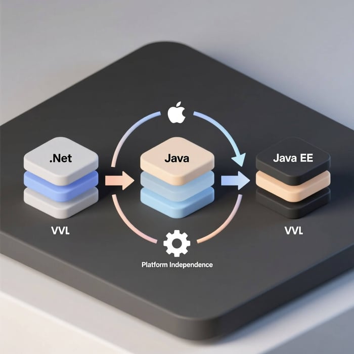 Les technologies Java et JVM de Sun sont basées sur une machine virtuelle. Elles dissimulent les détails matériels de l’ordinateur sur lequel leurs programmes s’exécutent. Elles utilisent un langage intermédiaire qui leur est propre bytecode Common Intermediate Language (MSIL devenu CIL) pour le système Microsoft. Elles se servent de Java byte-code pour Sun.