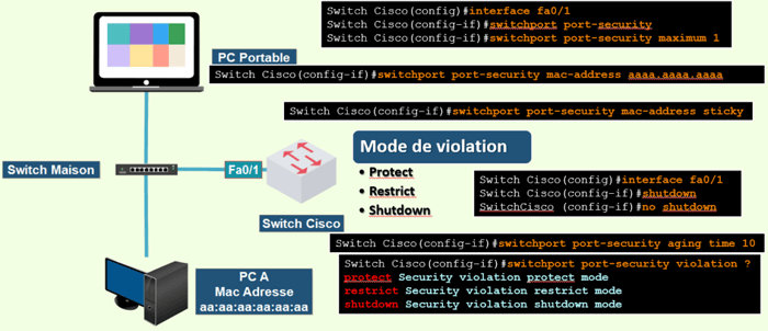 switchport port-securitypour activer la sécuritéswitchport port-security maximum 1pour limiter le nombre d’adresses MACswitchport port-security violation [Protect|Restrict|Shutdown]pour définir le mode de violation
