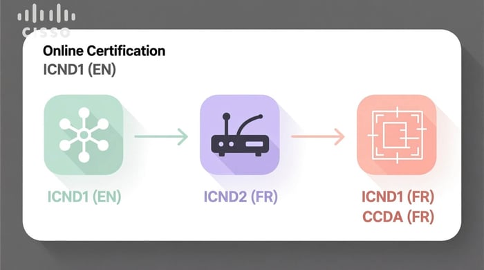 Un parcours typique inclut : ICND1 pour les bases réseau, ICND2 pour les concepts avancés et CCDA pour le design réseau. Les formations en e-learning Cisco sont particulièrement adaptées pour les personnes en activité professionnelle.