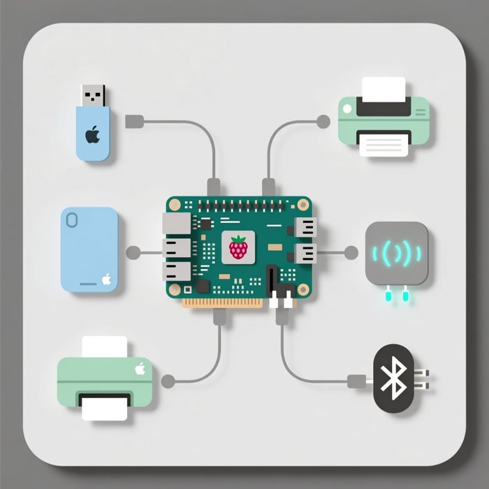 Si vous avez un Raspberry Pi A, vous pouvez connecter une carte réseau Ethernet ou Wi-Fi pour établir une connexion en réseau avec Internet. Le modèle B quant à lui a une carte Ethernet intégrée. Vous pouvez y connecter des unités de stockage externe telles que les clés USB ou des disques durs. Vous pouvez aussi rajouter des périphériques tels que les clés bluetooth, les imprimantes, les mémoires flash, etc.
